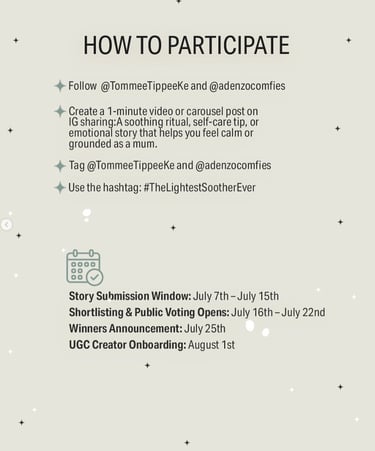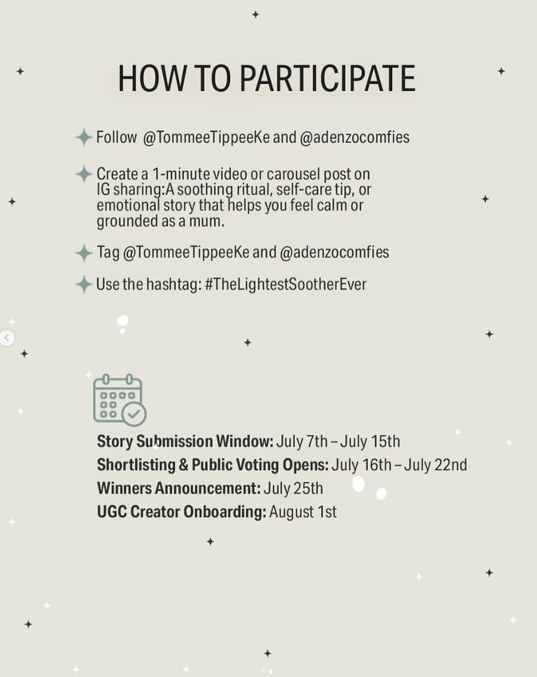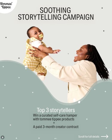To kick off our interactions with our amazing parenting community in Kenya, we launched our Soothing Storytelling Campaign. This competition asked parents to submit a 1-minute reel showing either a soothing ritual you use with your baby, a self-care tip that helps you stay calm or a short, emotional story about a personal mum moment that grounds you. Winners would collaborate with us as a paid UGC creator!
